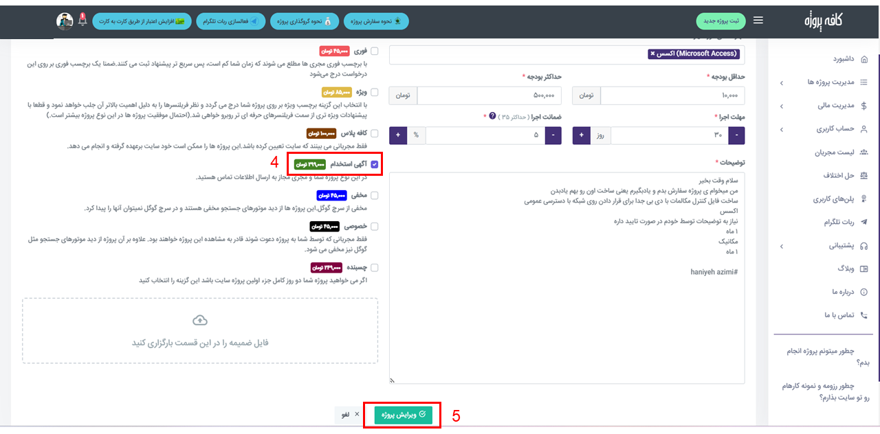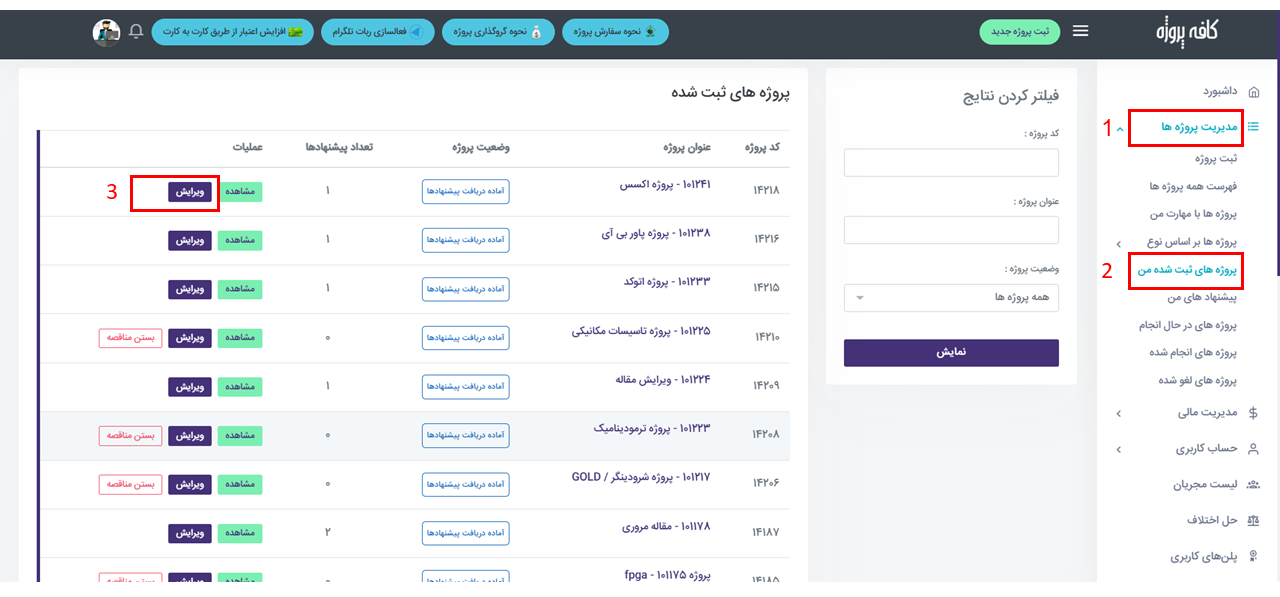 - اما در صورتی که پیش تر پروژه خود را ثبت کرده اید، ابتدا وارد حساب کاربری تان شوید. سپس از بخش مدیریت پروژه ها، گزینه ی پروژه های ثبت شده من را انتخاب کنید. بعد از آن، گزینه ویرایش پروژه مورد نظر را انتخاب کنید و گزینه ی آگهی استخدام را فعال کنید و در پایان، دکمه ویرایش پروژه را بزنید.