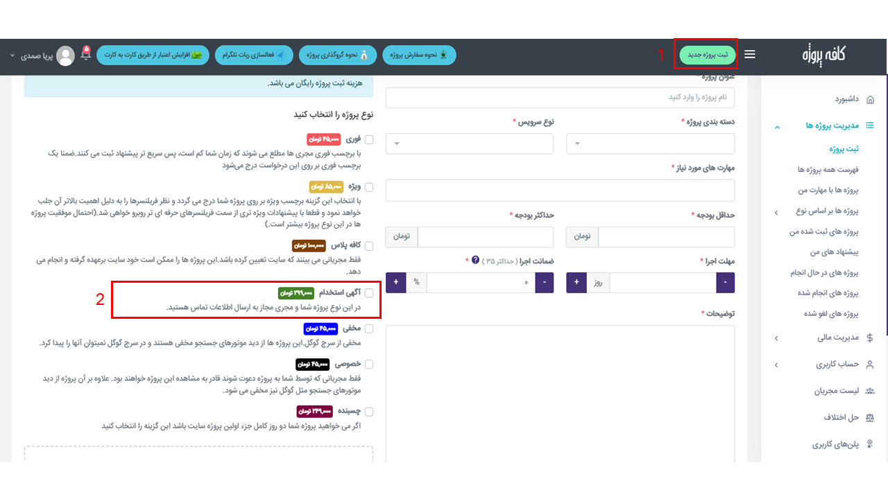 - برای ارتباط مستقیم با فریلنسر ابتدا وارد حساب کاربری خود شوید و هنگام ثبت یک پروژه جدید گزینه آگهی استخدام را فعال کنید.